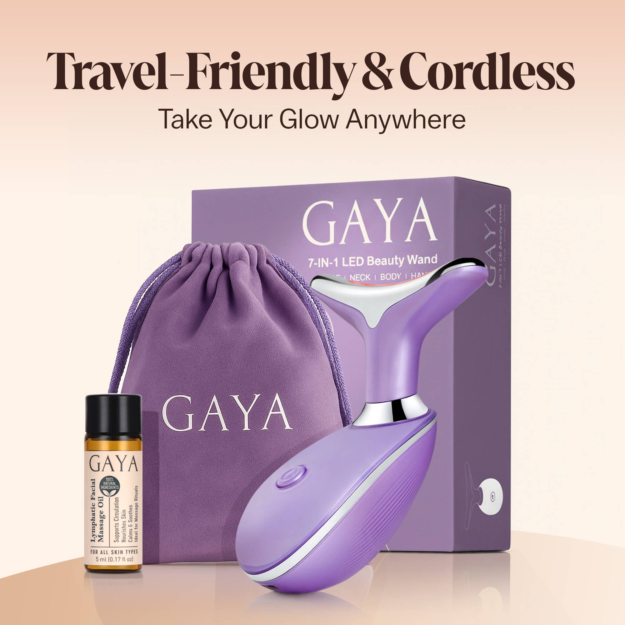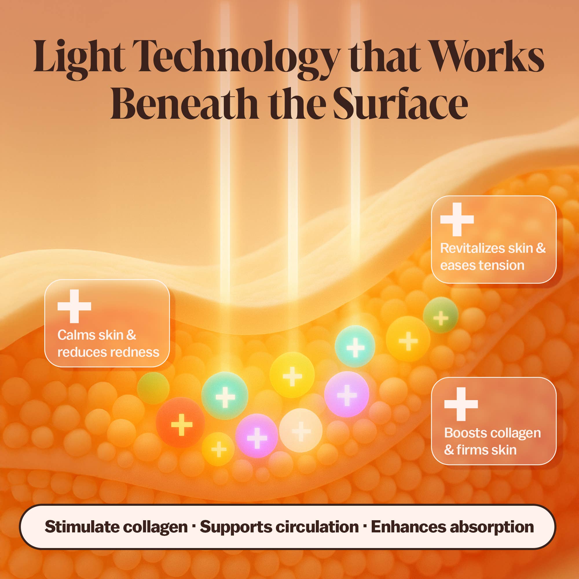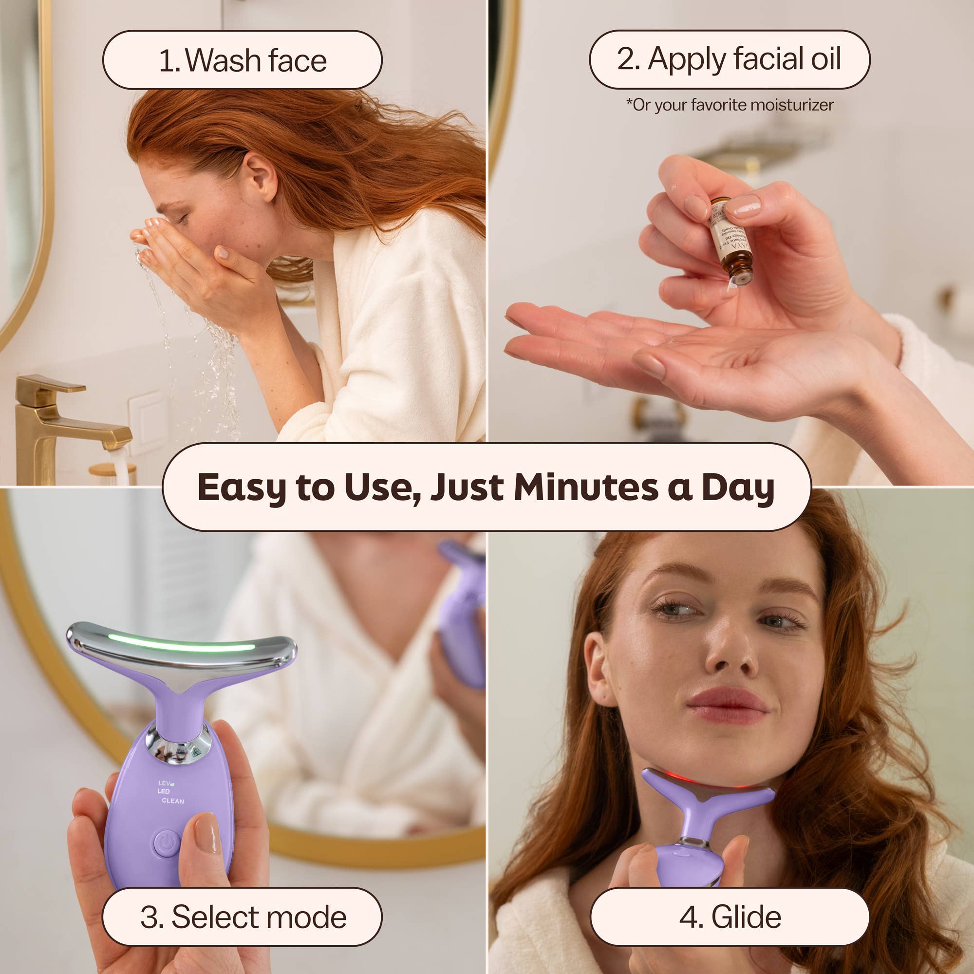 7 LED light colors for firming, brightening, and soothing care • Includes 100% natural face oil (jojoba & grapeseed blend) • Cordless, rechargeable with modern Type-C charger • Soft cloth travel bag + clear step-by-step manual & video • Suitable for face, neck, jawline, shoulders, and more