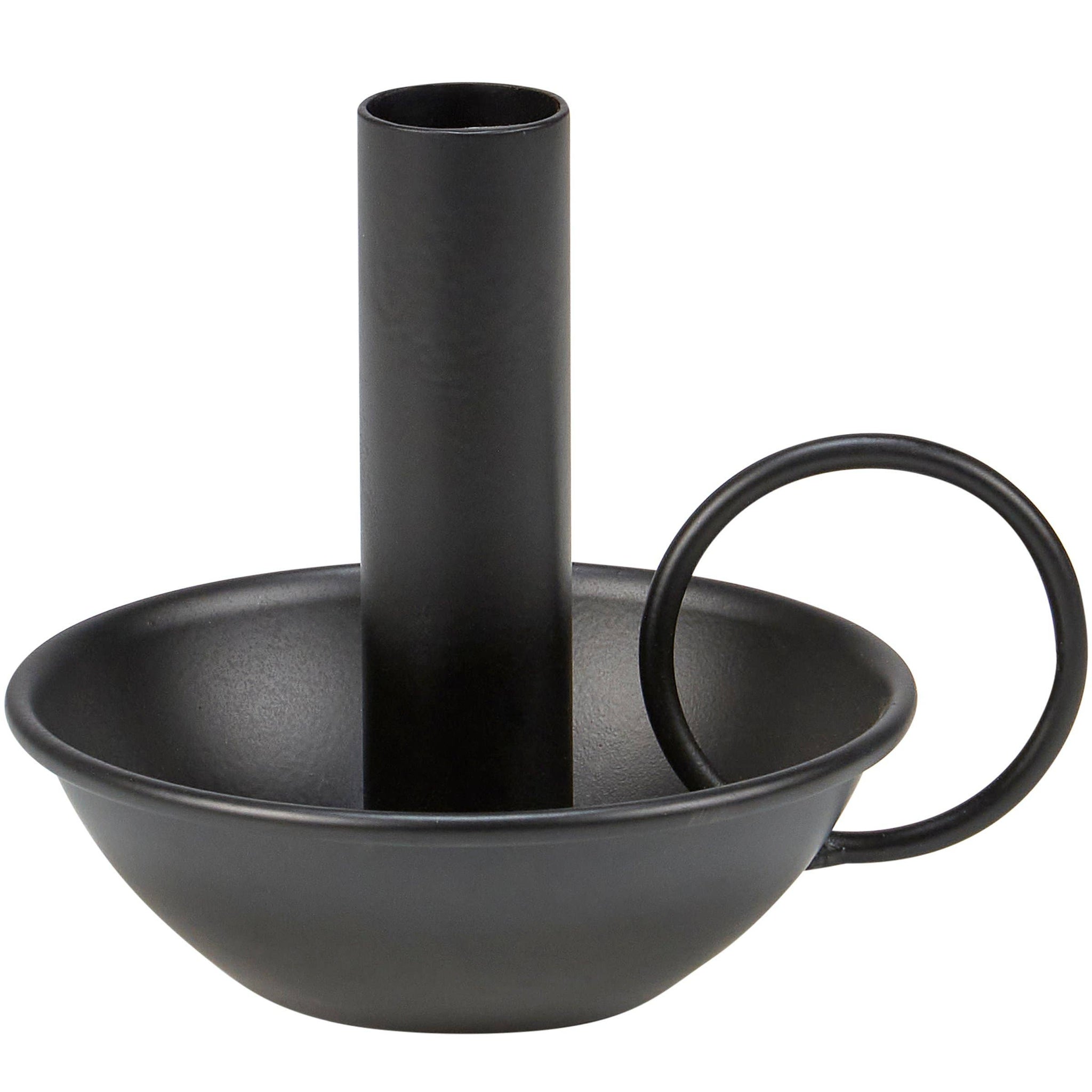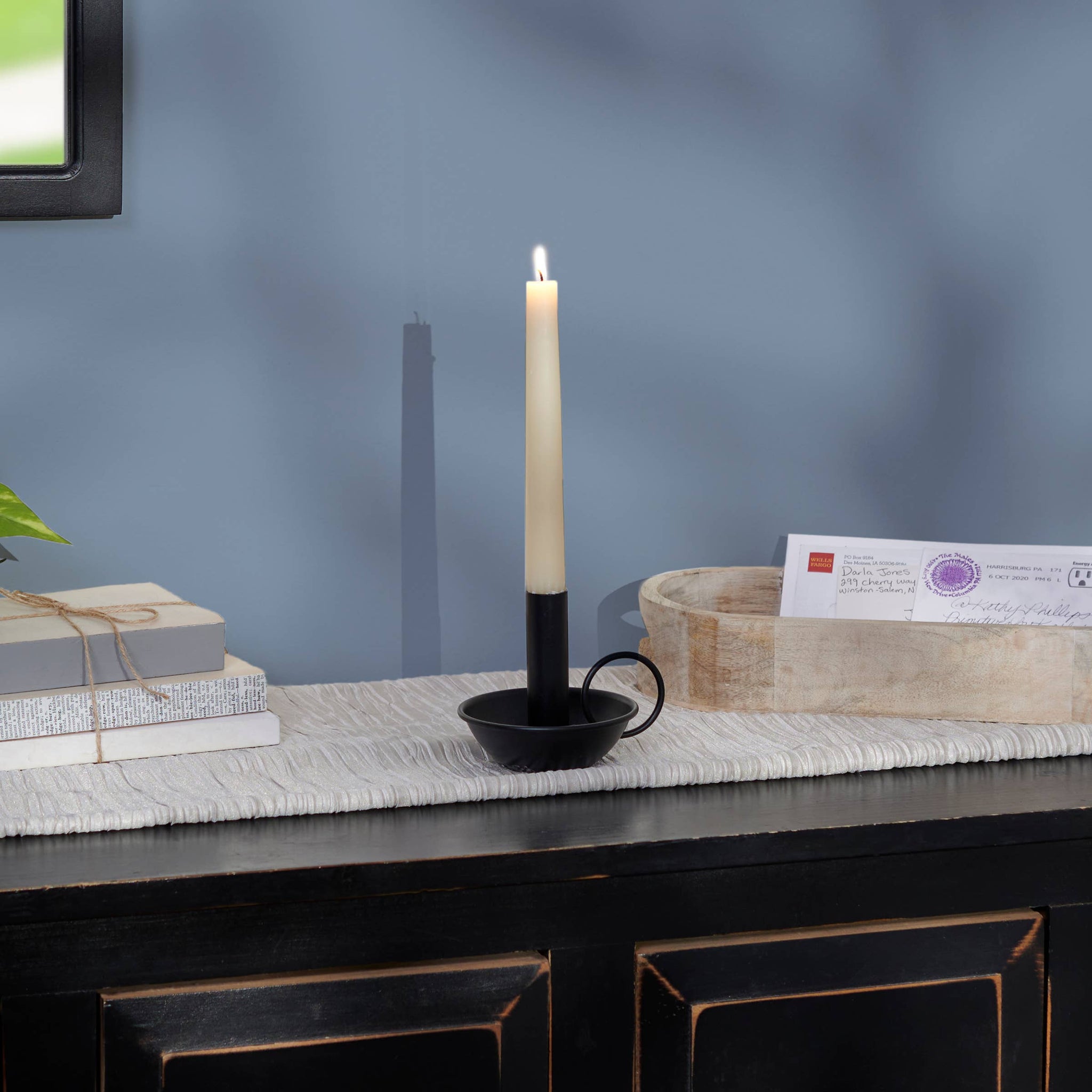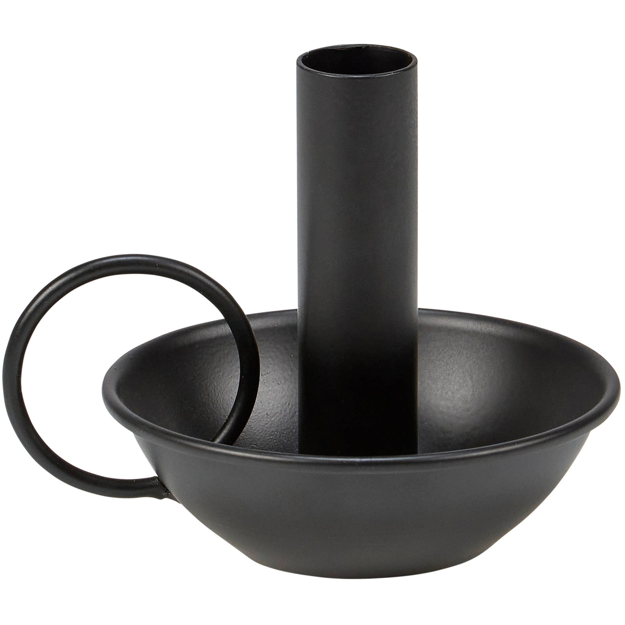 A metal candle holder from our Primitive Collection featuring a dark black color and vintage candlestick holder design with ring for a handle and space for a single candle. Our Primitive candle holder fits a standard taper candle and can free-stand on flat surface. Candle pictured not included. A rustic home accent perfect for adding natural lighting to any living space.