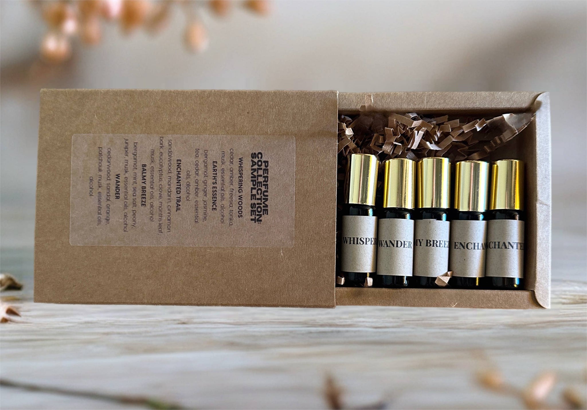 Scent Descriptions: BALMY BREEZE - blends florals, warm vanilla, and sandalwood for a carefree, sun-kissed scent. WANDER - pairs wild jasmine, cedarwood, and musk—a bold, feminine fragrance for life’s journey. WHISPERING WOODS - layers wildflowers, mahogany, and vetiver, capturing the soft mystery of the forest. EARTH’S ESSENCE - mixes rose, sandalwood, and amber—elegant and grounded, like the woman who wears it. ENCHANTED TRAIL - weaves lavender, honeysuckle, and cedar into a scent as adventurous and dreamy as a hidden woodland path.