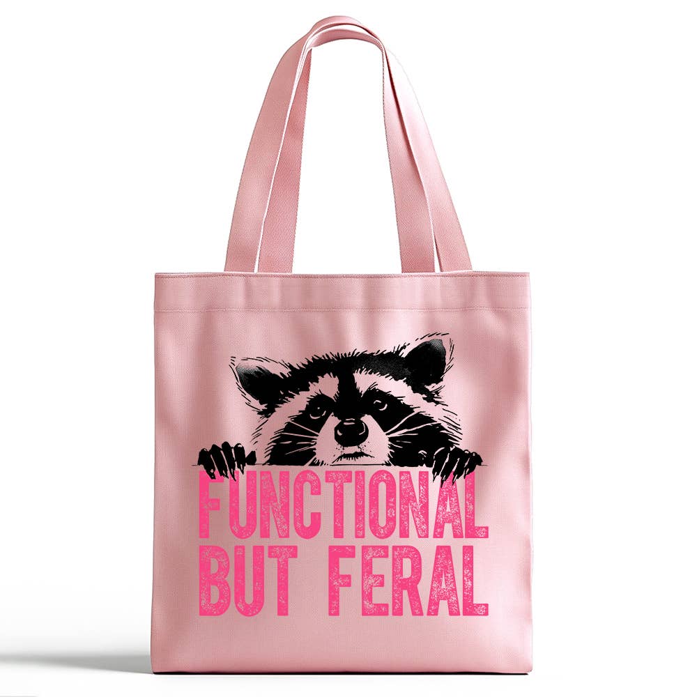 Functional But Feral Raccoon Tote Bag, Funny Sarcastic Gifts ABOUT THE TOTE Durability – Reinforced stitching at stress points for strength that lasts Spacious & Versatile – 16" tall x 15" wide Comfortable 22" Web Handles Thick 100% Cotton Canvas Designed & Printed in the USA by Loftipop. Blank tote sourced from Pakistan