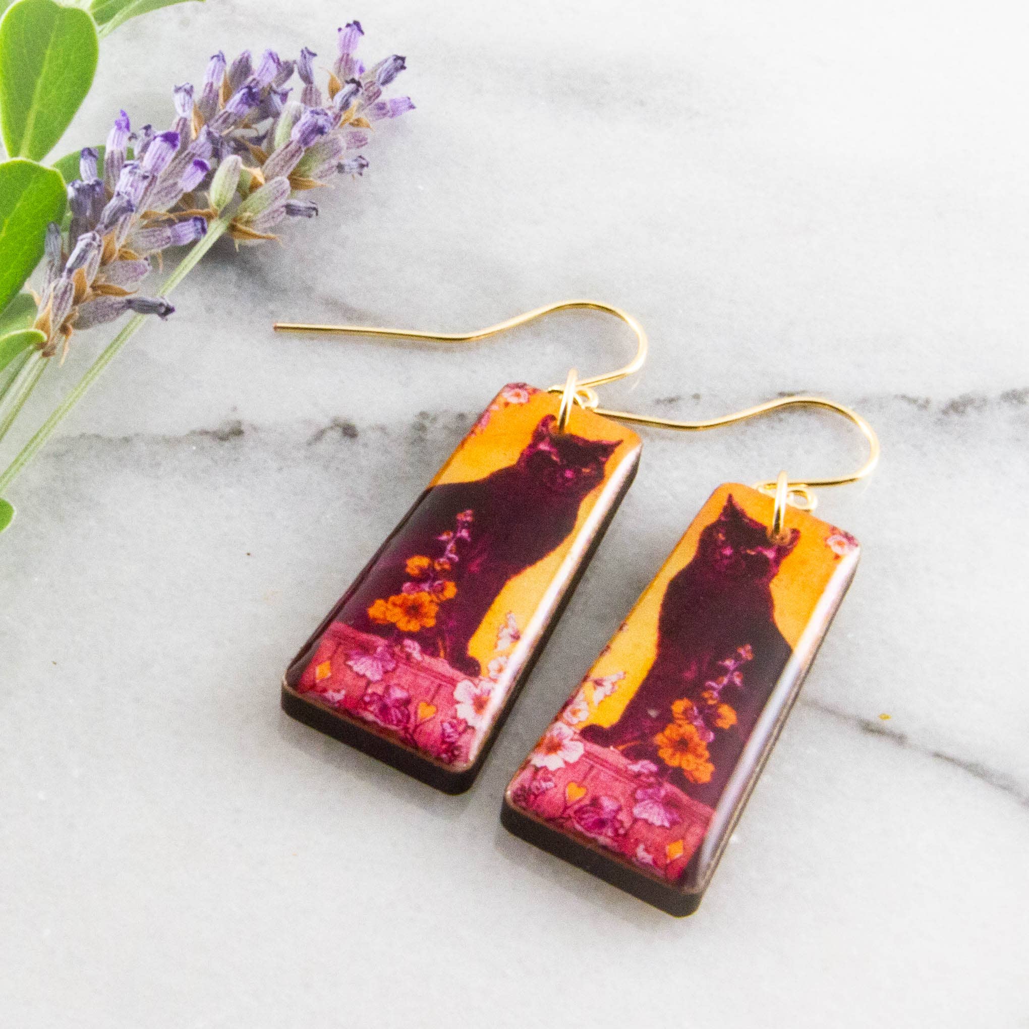 These charming earrings perfectly capture the spirit of French Art Nouveau! Featuring a vintage black cat illustration, rendered in vivid purple, pink, yellow, and orange.