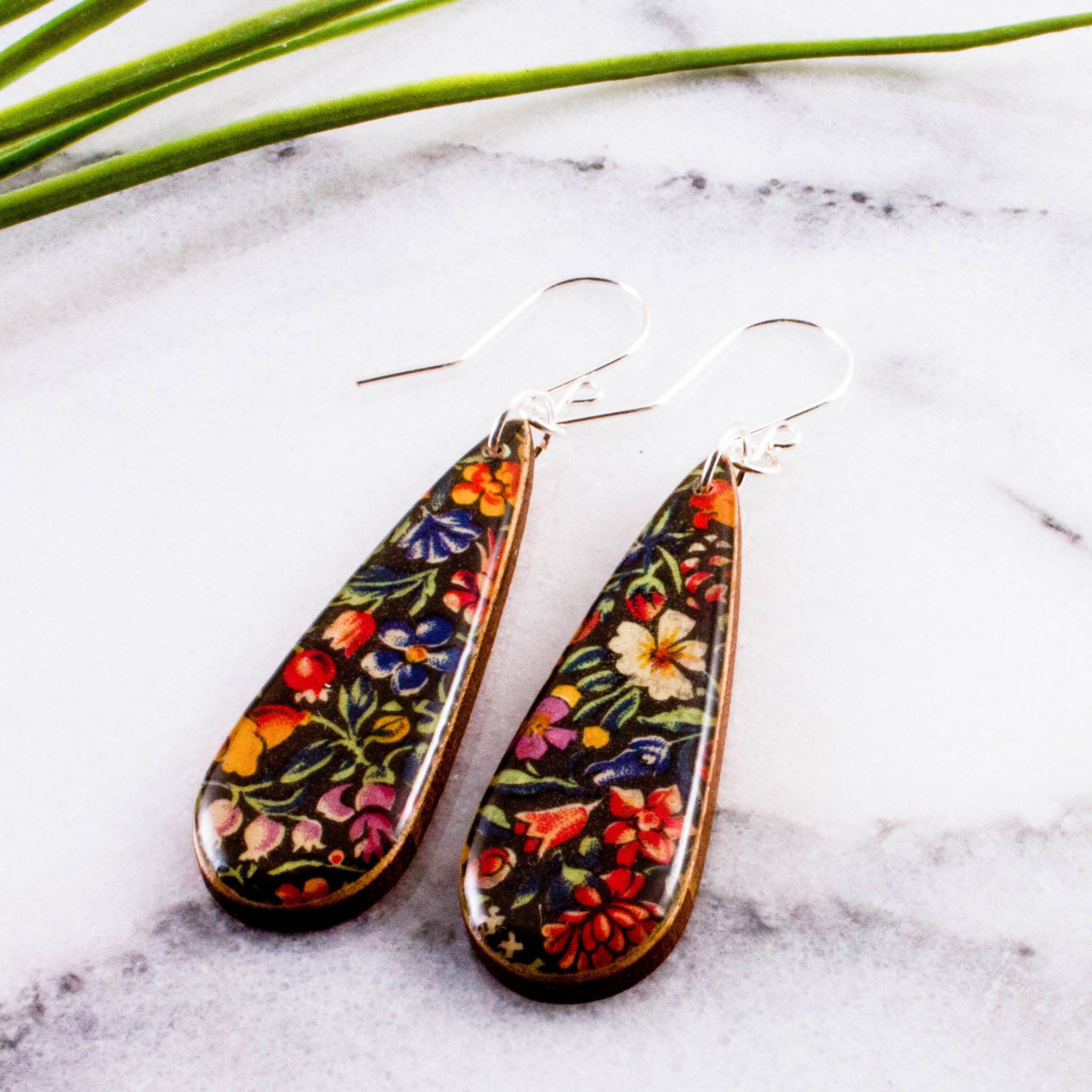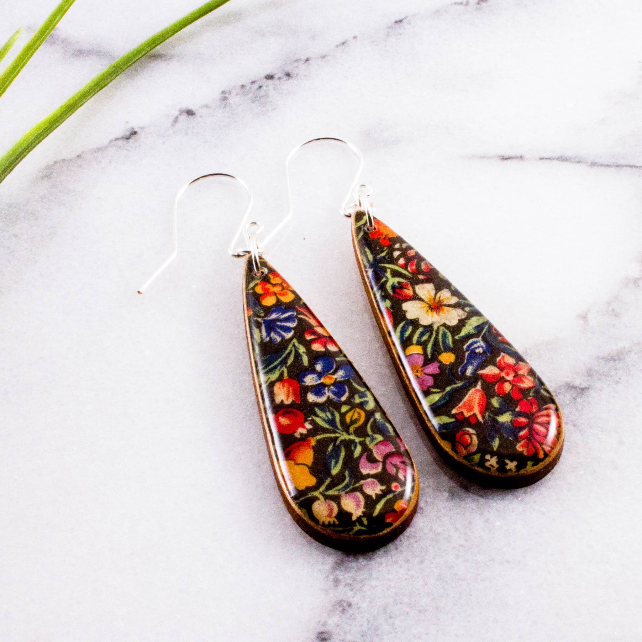 Handcrafted from sustainably harvested maple wood, handmade Italian papers, glossy, vegetable-based resin, and handcrafted gold-filled ear wires.