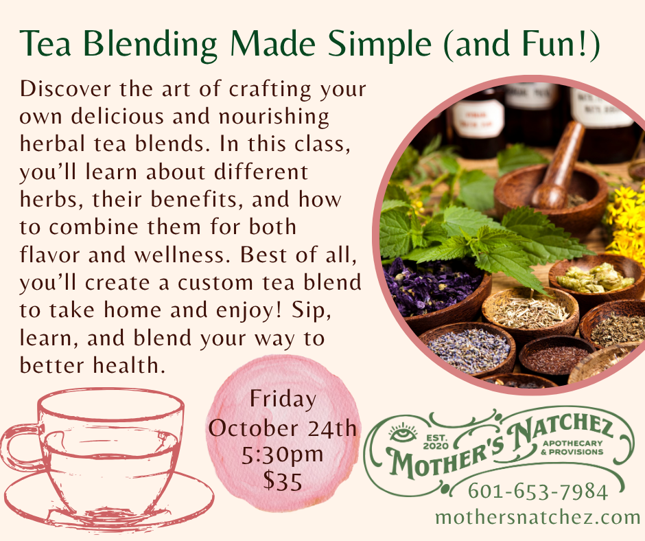 Unlock the power of herbs! Learn about herbs and how to make your own herbal blends to help with common ailments! This herbal class will also focus on blends perfect for Fall and the coming Cold/Flu season.