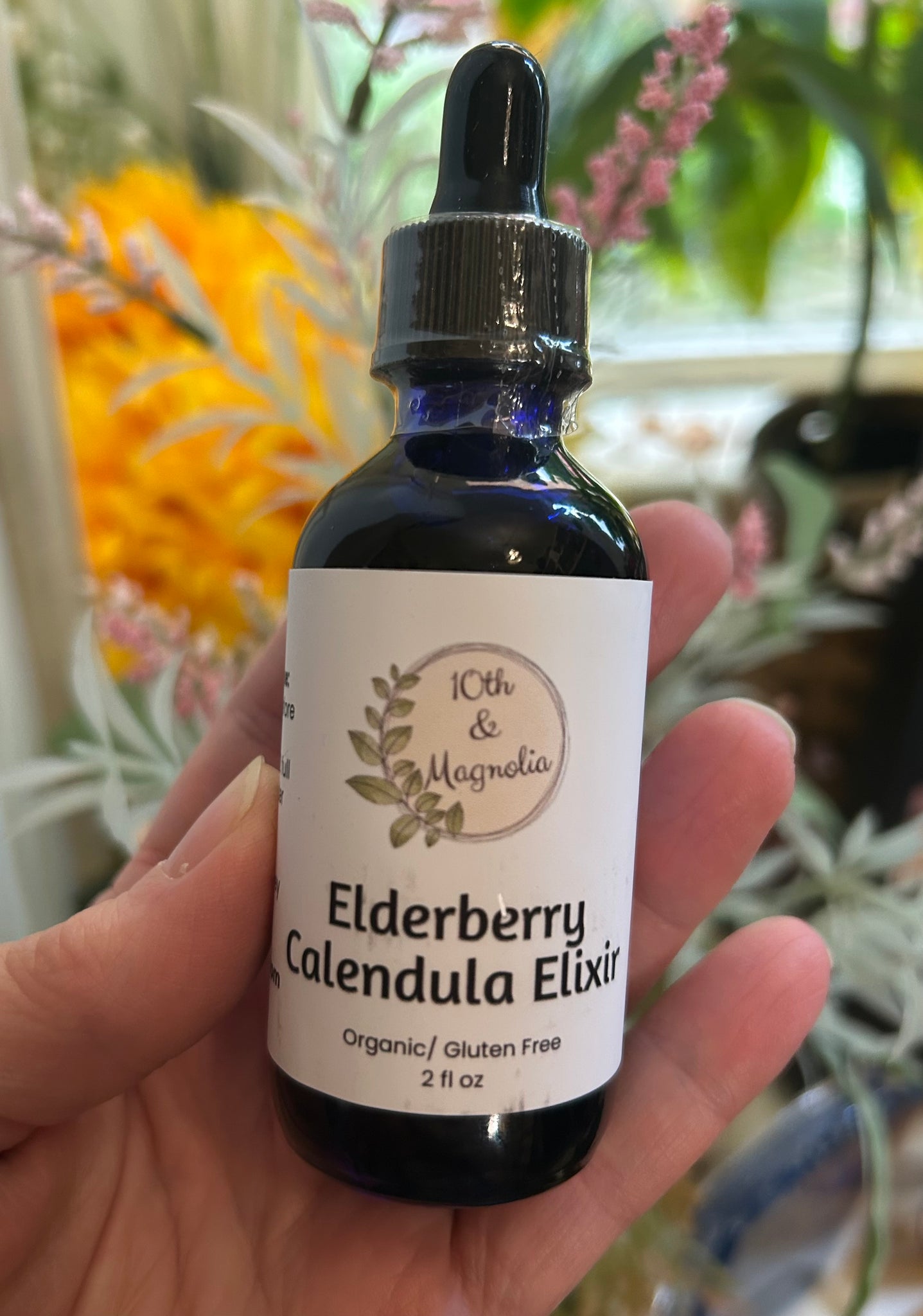 Elderberry, Elder Flower, Calendula, Brandy, Ginger, Clove, Star Anise, Cinnamon, Rose Hip, Lemon, Orange Peel, Honey