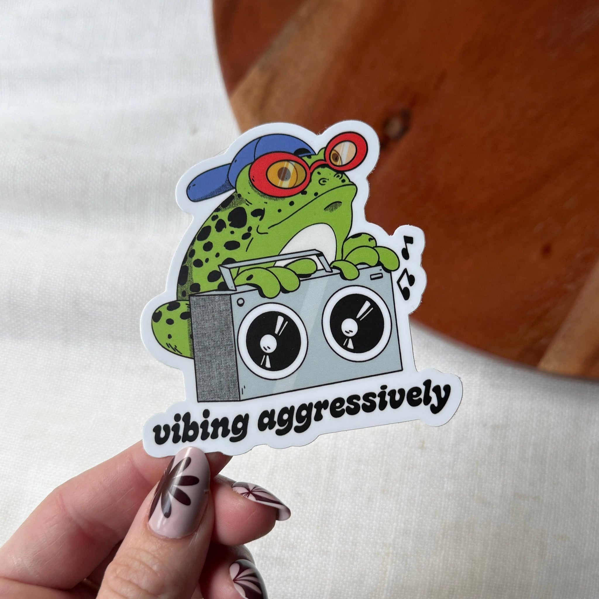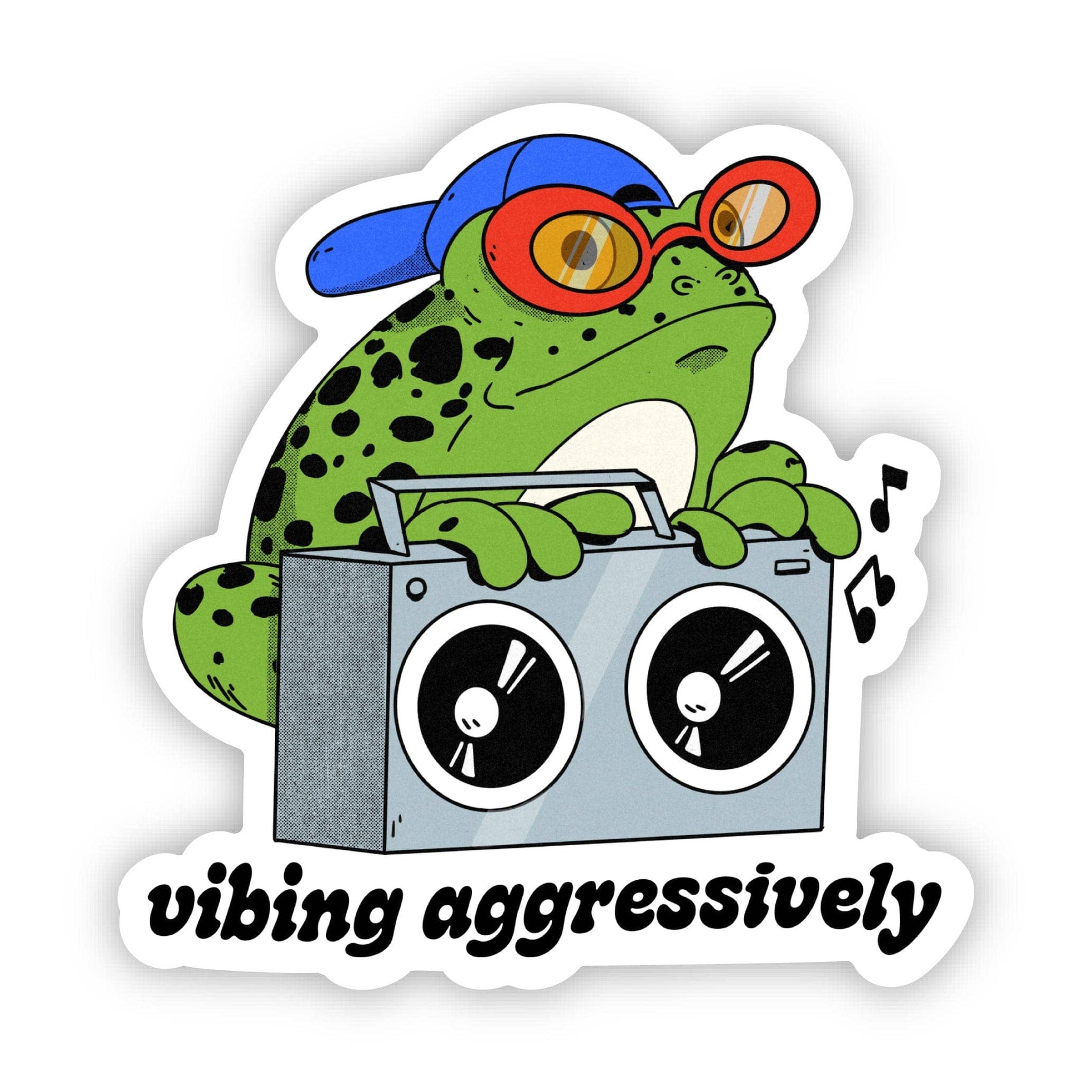 Don't forget to vibe (aggressively) with this cool frog. Gift this sticker to someone who can relate! High quality vinyl sticker. Great to decorate laptops, water bottles, car windows, coolers, suitcases, bikes, kayaks, phone cases, journals, and more. Details: • 2.9" x 3" • Printed and shipped with care from the U.S.A. • High quality and durable vinyl, indoor and outdoor use • Waterproof and weather resistant
